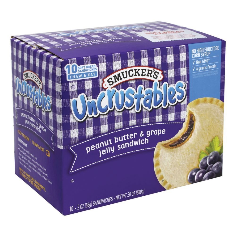 Smucker’s Uncrustables are ready-to-eat, crustless sandwiches made by The J.M. Smucker Company and sold frozen in grocery stores.  They have a soft circular shape with sealed edges and are filled with peanut butter and jelly (grape or strawberry or raspberry), honey, and one even foregoes the peanut butter and is filled with a chocolate-flavored hazelnut spread.  They are a remarkably simple affair – each sandwich is individually wrapped and frozen (you store them in your freezer); then simply take one out and let it sit at room temperature for about 30 minutes, unwrap it, and eat it.  No mess (but a wrapper to throw away), and no fuss (no need to get out a knife and your jars of peanut butter and jelly, prepare your sandwich, then wash off your knife and put your jars away).  It is literally thaw and eat!