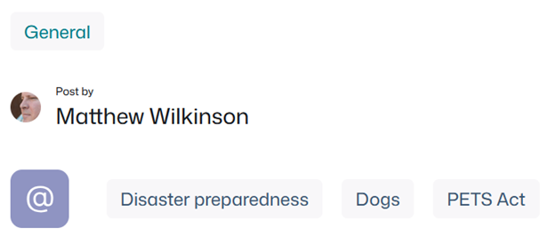 You can still see posts grouped by subject matter – click the category just below the content at the bottom of a post (e.g., “General” in the screenshot below) to see posts published in that category, or a tag next to the @ icon (e.g., “Dogs” in the screenshot below) to see posts tagged with that tag…