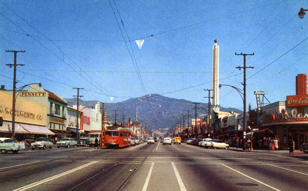Galveston’s Broadway would later become the inspiration for “Brand Boulevard,” seen in these two pictures — first (above) in the 1920’s as Leslie laid it out, though in place of the park in the middle of the motorway ran the Los Angeles Red Car, and then (below) in the 1950’s before the Harbor Freeway from Los Angeles to Pasadena became the nation’s first freeway and the Red Car was discontinued.