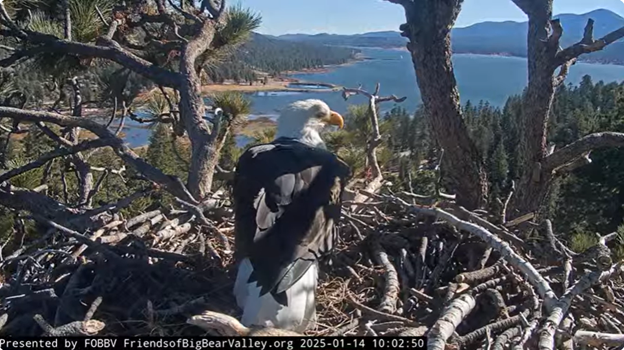Then I discovered Jackie and Shadow at Big Bear Bald Eagle Live Nest – Cam 1: https://www.youtube.com/watch?v=B4-L2nfGcuE, which has become my favorite, not only because Jackie and Shadow are preparing their nest for an egg, but because the cam’s position is pointing in my direction; I am located just beyond the lake and over the far hill in the desert below this beautiful mountain spot in Southern California where I used to go skiing. As I’m typing this, Jackie and Shadow are “home” working on the nest, and 2,974 people like me are watching them! We have a bird’s eye view of a bird’s eye view!