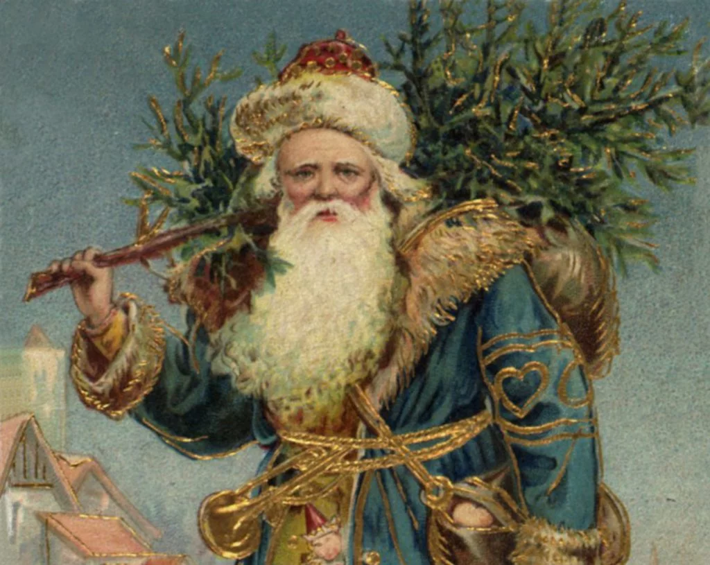 The legend of Saint Nicholas merged over the many centuries with local customs and traditions. In medieval England for example, Nicholas becomes Father Christmas – embodying the spirit of good cheer, feasting, and merriment – depicted as a kind woodsman in a warm, green overcoat.
