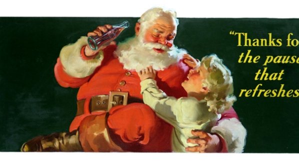 By the 20th century, Santa Claus became a central figure in the commercialization of Christmas. Coca-Cola’s advertising campaign in the 1930s featuring a Santa Claus created by artist Haddon Sundblom played a significant role in solidifying the modern image we have of him. Sundblom’s Santa radiated warmth and reminded people of their grandfather — a friendly man who loved children and enjoyed life. To give his creation humanity, Sundblom used a friend of his as the model for the character, adding a white beard flowing down over a long red coat generously outlined with white fur (red and white being the colors associated with Coca-Cola’s logo, the selling of Coke being the whole point of the ad campaign), an enormous brass buckle fastening a broad leather belt, and large floppy boots. He is, again, fat!