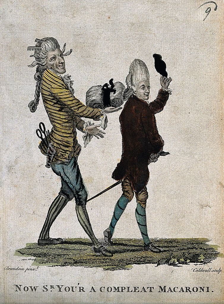 The new macaronis were characterized as gaunt men with tight pants, short coats, gaudy shoes, striped stockings, and fancy walking sticks, wearing their trademark extravagant wigs; often these wigs were heavily powdered and were nearly half the size of the macaronis themselves. One satirical illustration of the day (left) showed a macaroni with hair so long that he needed someone walking behind him to carry it around.